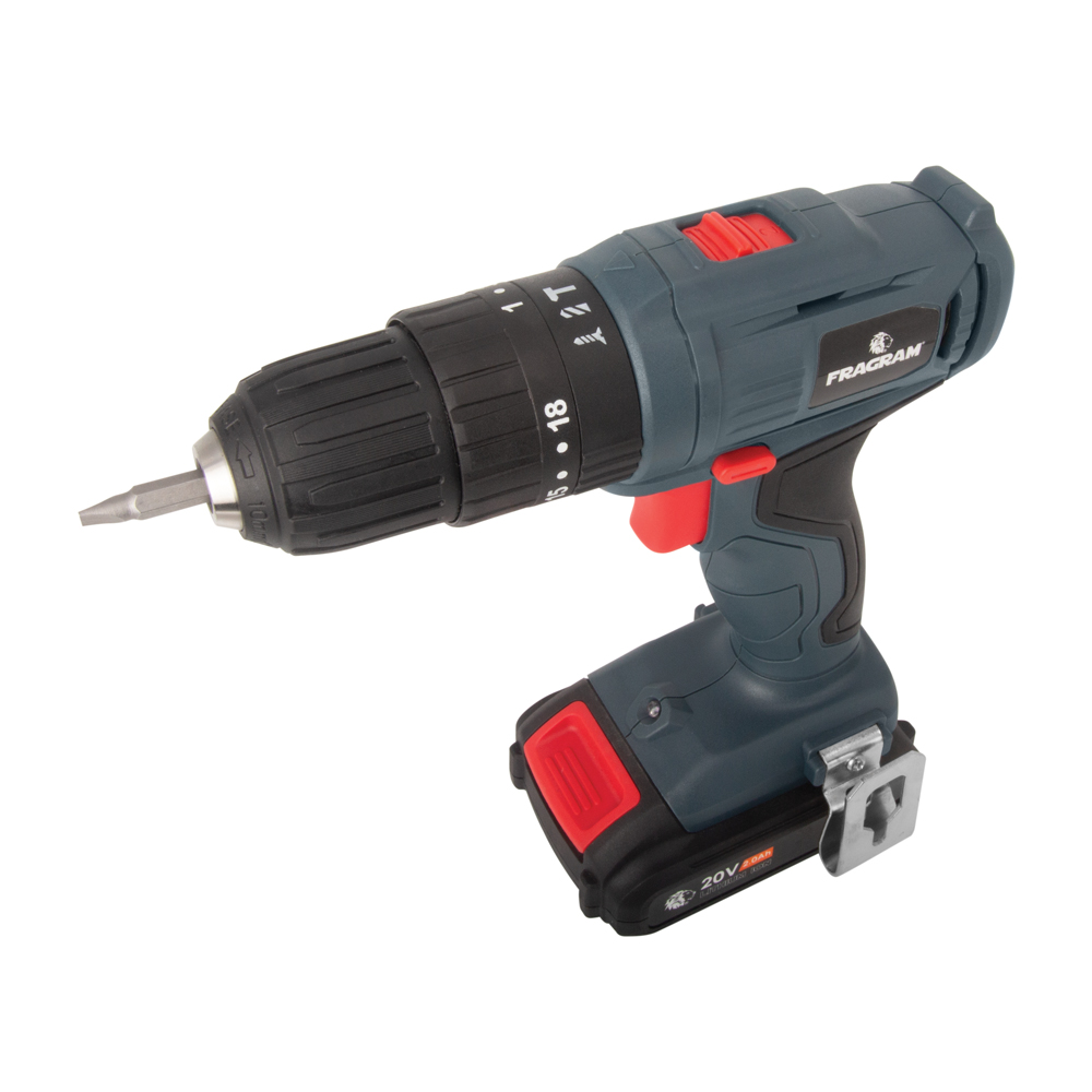 Ideal for the hobby enthusiast, the compact Fragram 20V Impact Drill is a handy power tool to use in and around the house or for DIY projects. The 30NM torque and 18 torque setting provides precise control for drilling into various materials, enabling the user to complete a wider variety of jobs with a single tool. The versatile impact drill has a drilling capacity of 20mm into wood and 10mm into steel and concrete. The 10mm keyless chuck allows efficient changing of drill bits. Fitted with a built-in LED light, the drill offers two speed adjustments for convenient control of speed on various surfaces.